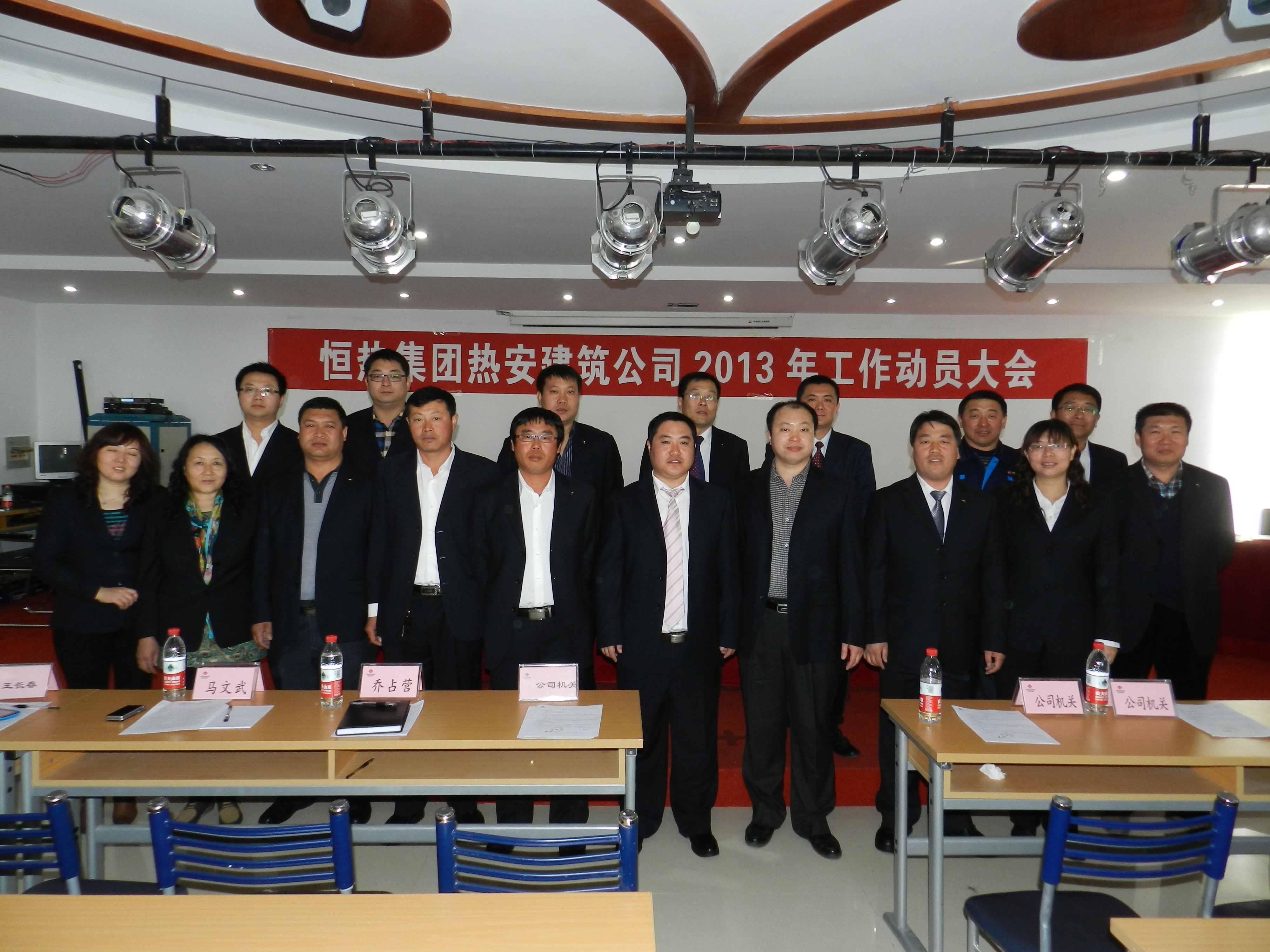 2013年4月29日(ri),上(shang)午8點(dian)(dian)整,在集團(tuan)公(gong)(gong)司(si)(si)五樓會(hui)(hui)議室召開了(le)恒熱集團(tuan)熱安建筑(zhu)公(gong)(gong)司(si)(si)2013年工(gong)作動員(yuan)大(da)會(hui)(hui),出(chu)席大(da)會(hui)(hui)的領(ling)導有:集團(tuan)公(gong)(gong)司(si)(si)財(cai)務(wu)總(zong)監劉(liu)大(da)志(zhi)(zhi)、綜(zong)合部(bu)(bu)(bu)部(bu)(bu)(bu)長兼總(zong)裁助理(li)(li)(li)陳虎、熱安建筑(zhu)公(gong)(gong)司(si)(si)總(zong)經理(li)(li)(li)楊立(li)(li)國、總(zong)工(gong)王一(yi)兵等公(gong)(gong)司(si)(si)領(ling)導,總(zong)工(gong)王一(yi)兵主持了(le)整個會(hui)(hui)議。在會(hui)(hui)上(shang),首先由總(zong)經理(li)(li)(li)楊立(li)(li)國先生對2013年的工(gong)作提出(chu)了(le)要求(qiu)和部(bu)(bu)(bu)署,然后(hou)由楊立(li)(li)國經理(li)(li)(li)分別與(yu)公(gong)(gong)司(si)(si)各部(bu)(bu)(bu)門中層簽(qian)訂了(le)績效(xiao)合同(tong),最后(hou)由集團(tuan)公(gong)(gong)司(si)(si)財(cai)務(wu)總(zong)監劉(liu)大(da)志(zhi)(zhi)和綜(zong)合部(bu)(bu)(bu)長兼總(zong)裁助理(li)(li)(li)陳虎代表集團(tuan)公(gong)(gong)司(si)(si)對熱安建筑(zhu)公(gong)(gong)司(si)(si)2013年的重點(dian)(dian)工(gong)作提出(chu)了(le)要求(qiu)。