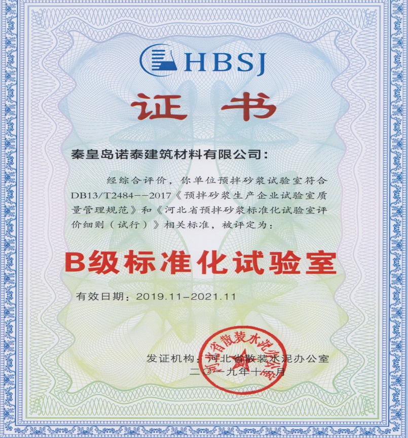 發布者:恒熱投資控股有限(xian)公司(si) 時間:2020-01-16為(wei)深化(hua)質量提(ti)升,確(que)保預拌(ban)砂(sha)漿產品質量,2019年11月,河(he)(he)北(bei)省(sheng)發(fa)(fa)改委(wei)聯合(he)秦皇島市發(fa)(fa)改委(wei)散裝水(shui)泥辦公室(shi)(shi)共同組織對河(he)(he)北(bei)省(sheng)范圍內的預拌(ban)砂(sha)漿企業(ye)試(shi)驗(yan)室(shi)(shi)標準(zhun)化(hua)管理工作進行了專項評(ping)(ping)定,諾泰建筑材料有(you)限公司(si)實驗(yan)室(shi)(shi)被評(ping)(ping)定為(wei)B級標準(zhun)化(hua)試(shi)驗(yan)室(shi)(shi)。