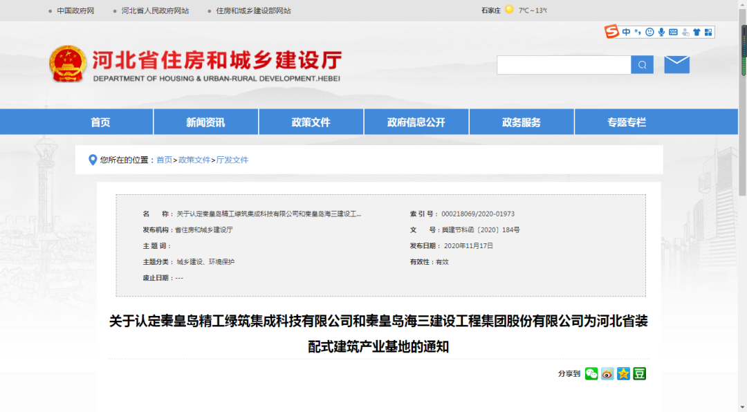 關于認定秦皇島精工綠筑集成科技有限公司和秦皇島海三建設工程集團股份有限公司為河北省裝配式建筑產業基地的通知